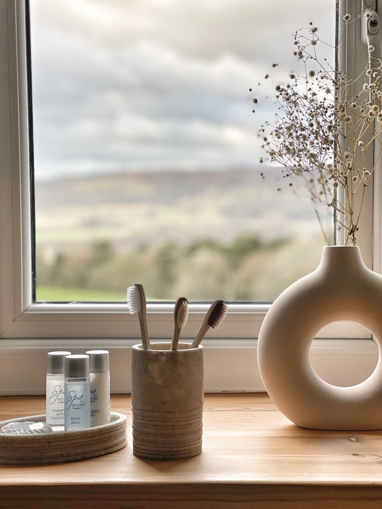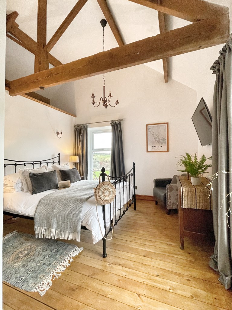 Upstairs there is the master bedroom which offers a king-size bed, vaulted ceiling with exposed beams and wall mounted Smart TV. There is a picture window offering beautiful views over the valley. The second bedroom is a king-size zip-and-link (which can be made into a twin upon request) with views over the courtyard and uphill to the fields and forest. There is a further single bedroom suitable for children with outstanding views over the surrounding countryside. The bathroom is a welcoming space to relax after a day hiking the hills and offers a beautiful bath with central taps and handheld shower, separate enclosed shower, and WC.